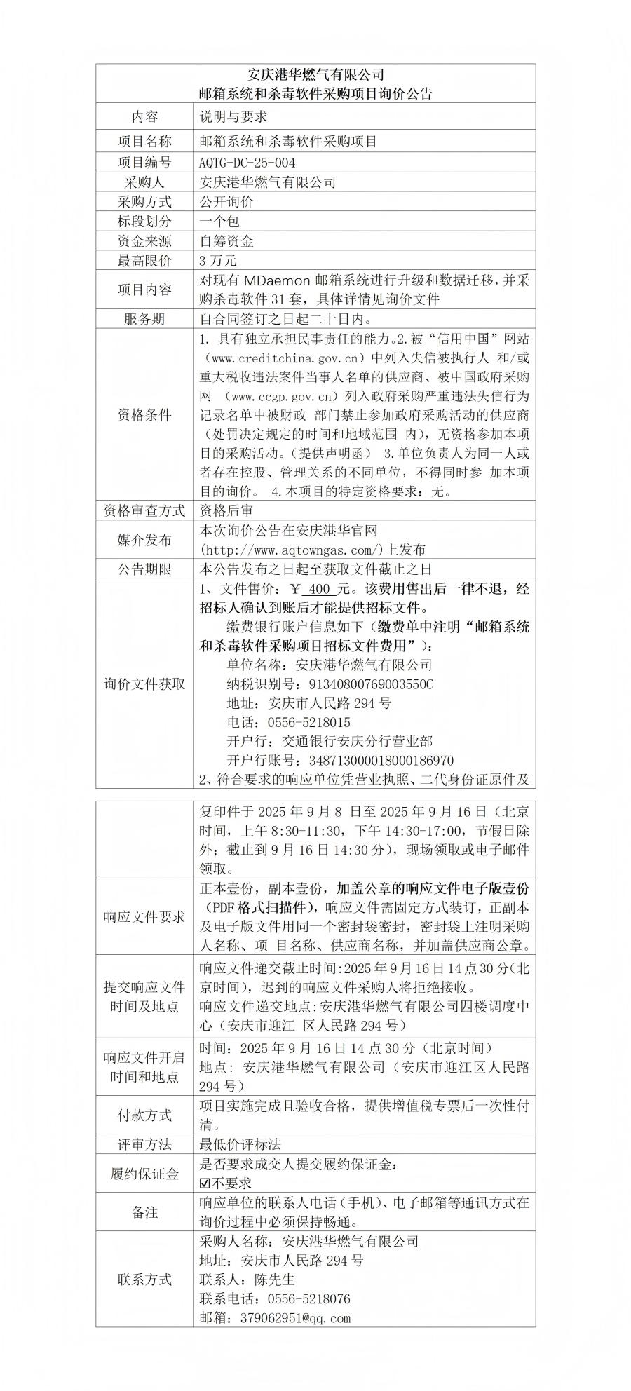 安慶港華燃氣有限公司郵箱系統(tǒng)和殺毒軟件采購項目詢價公告