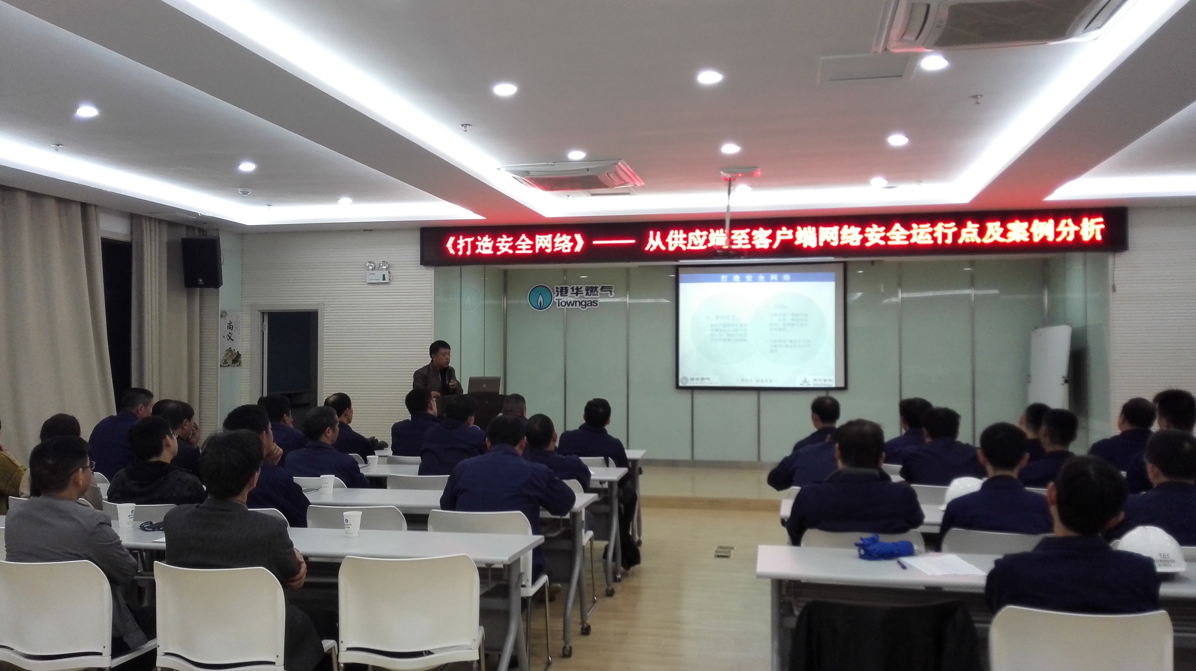 1025日,安慶港華年度培訓(xùn)重點(diǎn)項(xiàng)目《經(jīng)理講堂》第二場——《打造安全網(wǎng)絡(luò)》開講,課題由管網(wǎng)運(yùn)行部經(jīng)理主講,公司管網(wǎng)、市務(wù)、客服、風(fēng)險(xiǎn)等運(yùn)行部門近40名員工參加培訓(xùn)。